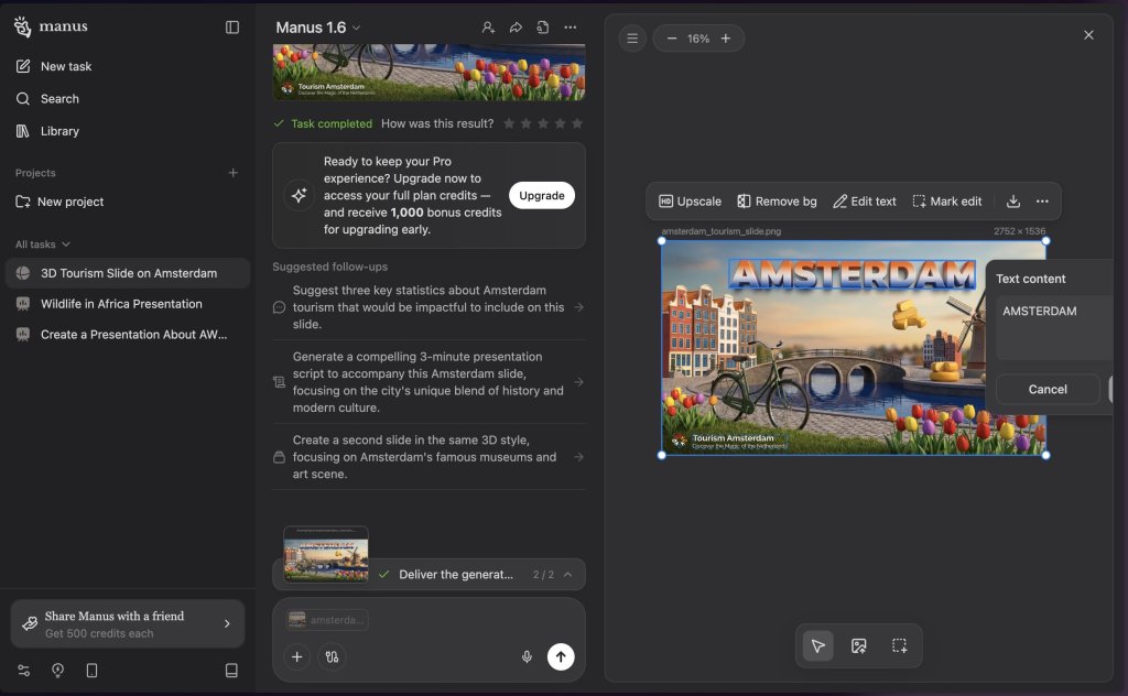 Manus recently added the ability to edit text directly on slides generated with Nano Banana Pro, plus point-and-edit for visual elements.