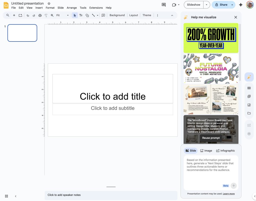3. Now you can see in the right side panel that Google Slides will suggest a few prompts with visual examples.