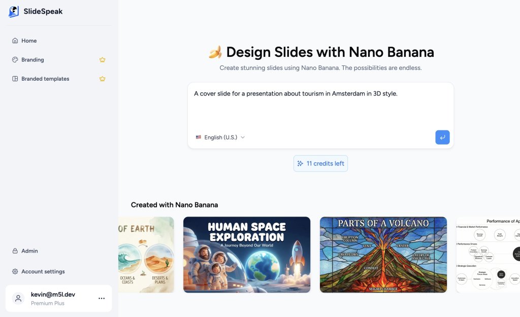 Note: You need a Premium ($29/m) or Premium Plus subscription to generate slides with Nano Banana in SlideSpeak.
