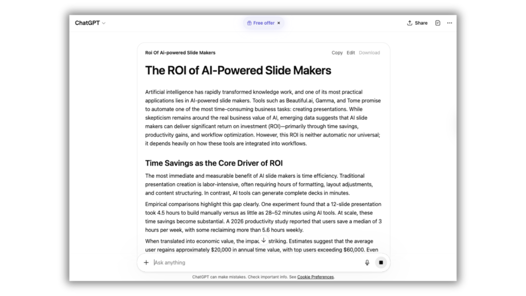 ChatGPT has a built-in web search. When it needs current information — recent research, news, updated statistics — it can pull from the web and cite its sources. This makes it more useful for research tasks that require recent material, not just information from the model’s training data.