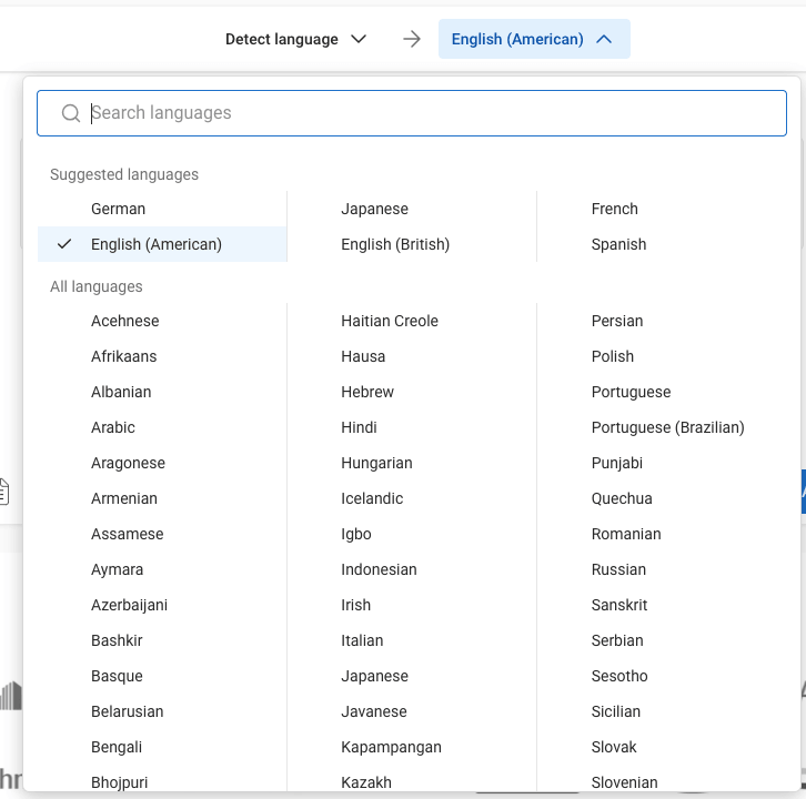 Once your account has been created, you can upload your PDF. DeepL will automatically detect the original language of the document. Choose from a list of languages to translate the document.