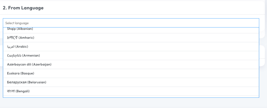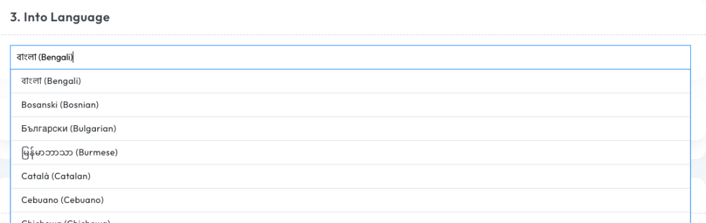 Choose target language (100+ options). SlideSpeak’s AI PDF translator supports over 100 languages, including major ones such as English, Spanish, Arabic, Chinese, Portuguese, Japanese, and more. This broad coverage makes it suitable for global teams and international content.